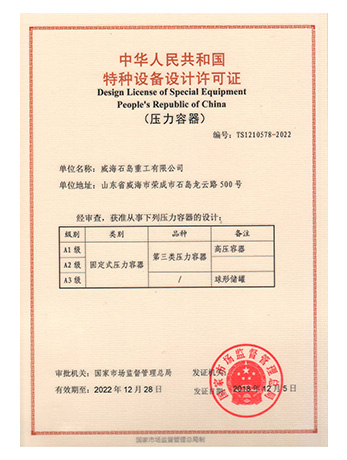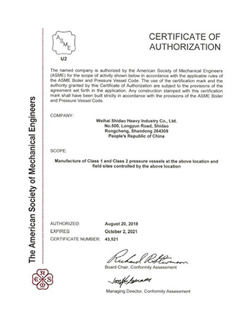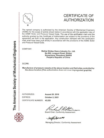 Weihai Shidao Heavy Industry Co., Ltd. inherits Mount Taishan Group's long experience in manufacturing boiler and pressure vessels, and has successively obtained the manufacturing and design licenses for A1, A2 and A3 pressure vessels officially issued by the state. With the outward development of the product, it has obtained ASME certification in the United States.
