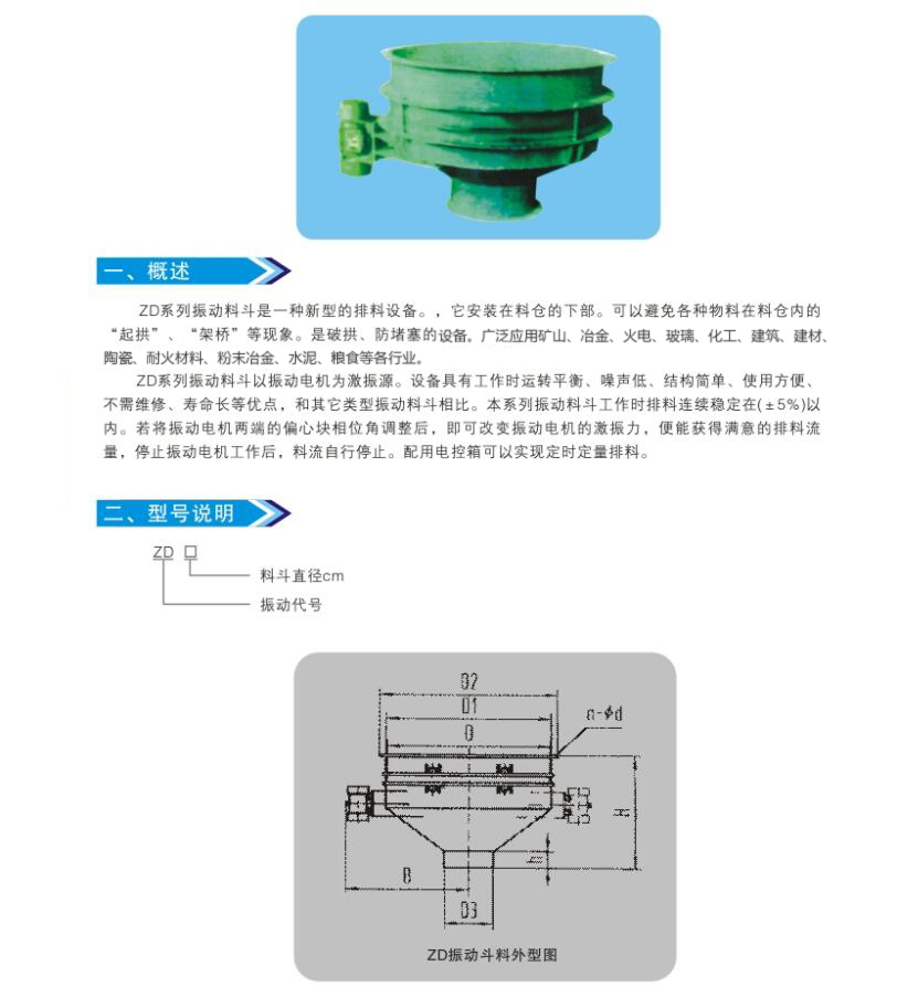ZD系列振動料斗是一種新型的排料設備。,它安裝在料倉的下部。可以避免各種物料在料倉內的“起拱”、“架橋”等現象。是破拱、防堵塞的有效設備。廣泛應用礦山、冶金、火電、玻璃、化工、建筑、建材、陶瓷、耐火材料、粉末冶金、水泥、糧食等各行業。